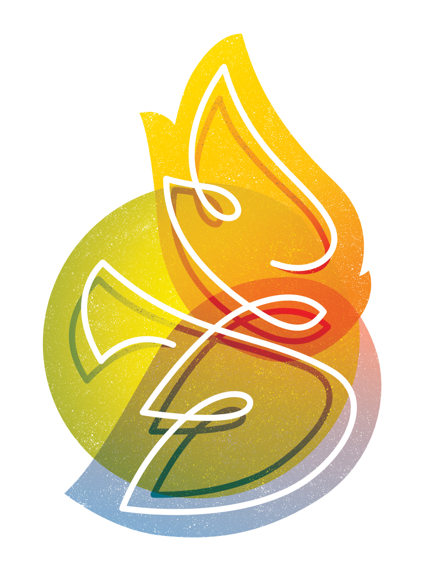 De illustratie toont een vlamvormig symbool in levendige kleuren dat de veelzijdige werking van Gods Geest uitbeeldt. De witte lijn die door het symbool loopt, verwijst naar de Heilige Geest als een duif, terwijl de vlam de vurigheid van de Geest symboliseert. De druppel staat voor het levengevende water en de kleurigheid representeert zowel de creativiteit van de Schepper als de veelkleurigheid van de schepping en de kerk.