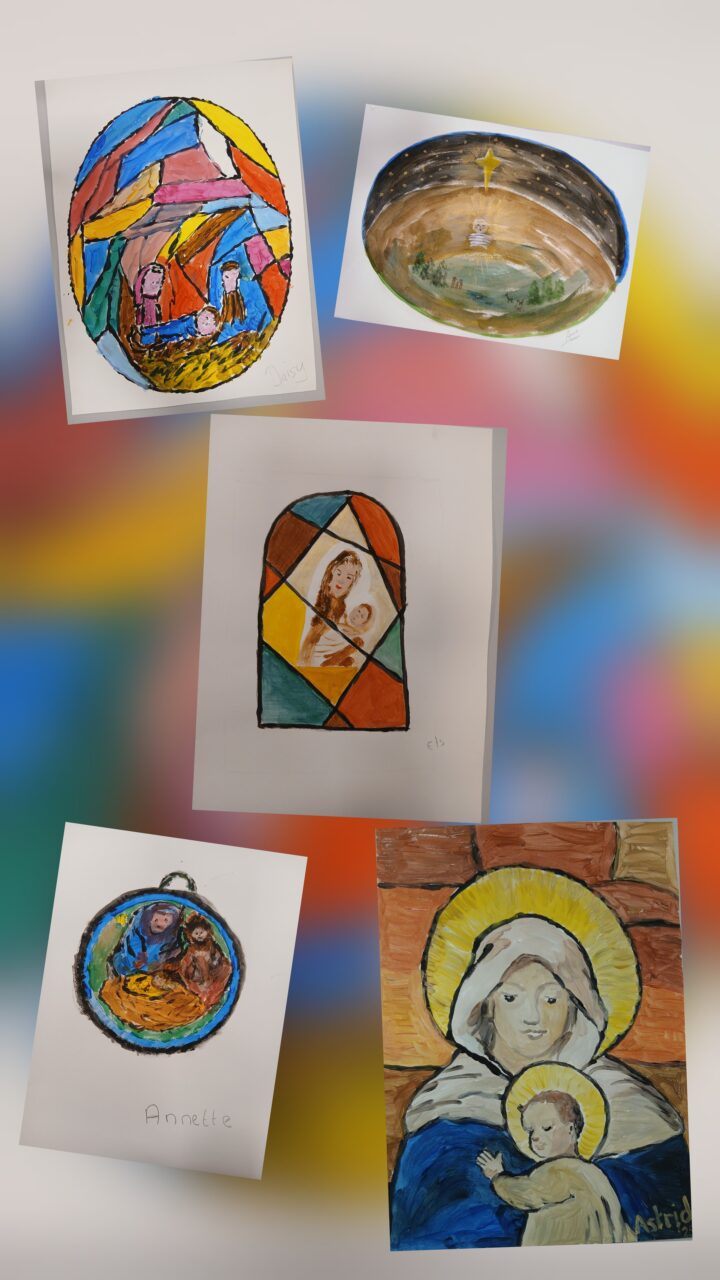 5 deelnemers zijn aanwezig. Alle materialen staan uitnodigend klaar, verf, heel veel verf en heel veel penselen, dikke en dunne. Op de tafel liggen de Bijbels en we lezen samen de gedeeltes over de geboorte van Jezus uit Lucas en uit Matteüs. We bespreken de verschillen. Dan bekijken we een diapresentatie met schilderijen uit verschillende periodes en verschillende stijlen. En dan zelf aan de slag, een voorbeeld gebruiken mag maar zelf iets bedenken mag natuurlijk ook. Eerst wordt er nog wat gelachen en gekletst maar dan wordt het stil en is ieder voor zich intensief bezig met het Kerstverhaal, de geboorte van de Here Jezus.